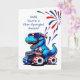 Este cartão de 4 de julho de alta energia é perfeito para o seu filho aventureiro! Apresentando um dinossauro vermelho, branco e azul cavalgando um caminhão monstro patriótico, ele foi projetado para capturar o entusiasmo de fogos de artifício e diversão de verão. Com estrelas, listras e legal óculos de sol, este T-Rex está pronto para celebrar! As cores ousadas e o tema divertido fazem dele um excelente para filhos que amam dinossauros, caminhões, e tudo o que é incrível sobre o Quarto.