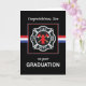 Felicite o seu filho pela sua formação na Academia de Corpo de Bombeiros. Um fundo preto dispara a faixa vermelha branca e azul atrás do emblema do corpo de bombeiros. Um cartão bonito para dizer parabéns.