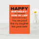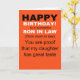 O filho prova o bom gosto da filha, diz a frente deste cartão de aniversário engraçado. O cartão foi feito com uma mãe em mente que deseja provocar o marido de sua filha enquanto celebra a velhice em um ano. A mensagem bonitinha na dentro mostra o doce elogio na frente em uma jaqueta sorrateira, mas chocante e humorística que fará o marido da filha rir em voz alta.
