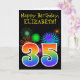 A frente deste design de carta de saudação de aniversário vibrante e divertida apresenta um padrão colorido inspirado por fogos de artifício celebratórios, juntamente com o número "35", tendo um padrão de gradação inspirado no arco-íris multicolorido, num fundo de cor preta. A frente também apresenta uma mensagem de saudação de aniversário, incluindo um nome de destinatário personalizável. O dentro apresenta uma mensagem de saudação de aniversário personalizada, ou talvez possa ser apagado e deixado o vazio se uma mensagem for escrita manualmente. Um cartão de aniversário personalizado como este pode ser uma maneira divertida de enviar desejos de aniversário a alguém que comemora seus trinta e cinco anos. [~Z0000330]