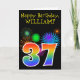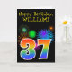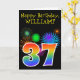 A frente deste design de carta de saudação de aniversário vibrante e divertida apresenta um padrão colorido inspirado por fogos de artifício celebratórios, juntamente com o número "37", tendo um padrão de gradação inspirado no arco-íris multicolorido, em um fundo de cor preta. A frente também apresenta uma mensagem de saudação de aniversário, incluindo um nome de destinatário personalizado. O dentro apresenta uma mensagem de saudação de aniversário personalizável, ou talvez possa ser apagado e deixado o vazio se uma mensagem for escrita manualmente. Um cartão de aniversário personalizável como este pode ser uma maneira divertida de reconhecer o trinta e sete anos de alguém. [~Z0000330]