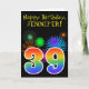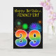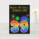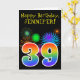 A frente deste design de carta de saudação de aniversário vibrante e divertida apresenta um padrão colorido inspirado em fogos de artifício celebratórios, juntamente com o número "39", tendo um arco-íris multicolorido como um padrão de gradiente, em um fundo preto colorido. A frente também apresenta uma mensagem de saudação de aniversário, incluindo um nome de destinatário personalizado. O dentro apresenta uma mensagem de saudação de aniversário personalizada, ou talvez possa ser apagado e deixado o vazio se uma mensagem for escrita manualmente. Um cartão de aniversário personalizado como este pode ser uma maneira divertida de reconhecer o trigésimo nono aniversário de alguém. [~Z0000330]