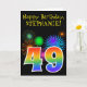 A frente deste design de carta de saudação de aniversário vibrante e divertida apresenta um padrão colorido inspirado em fogos de artifício celebratórios, juntamente com o número "49", tendo um padrão de gradação inspirado no arco-íris multicolor, num fundo de cor preta. A frente também apresenta uma mensagem de saudação de aniversário, incluindo um nome de destinatário personalizado. O dentro apresenta uma mensagem de saudação de aniversário personalizada, ou talvez possa ser apagado e deixado o vazio se uma mensagem for escrita manualmente. Um cartão de aniversário personalizável como este pode ser uma maneira divertida de enviar uma mensagem em comemoração dos quarenta e nono anos de alguém. [~Z0000330]