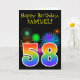 A frente deste design de carta de saudação de aniversário vibrante e divertida apresenta um padrão colorido inspirado em fogos de artifício celebratórios, juntamente com o número "58", que apresenta um padrão de gradação inspirado no arco-íris multicolor, em um fundo de cor preta. A frente também apresenta uma mensagem de saudação de aniversário, incluindo um nome de destinatário personalizado. O dentro apresenta uma mensagem de saudação de aniversário personalizada, ou talvez possa ser apagado e deixado o vazio se uma mensagem for escrita manualmente. Um cartão de aniversário personalizado como este pode ser uma maneira divertida de enviar uma mensagem em comemoração dos cinquenta e oito anos de alguém. [~Z0000330]