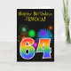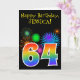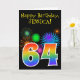 A frente deste design de carta de saudação de aniversário vibrante e divertida apresenta um padrão colorido inspirado em fogos de artifício celebratórios, junto com o número "64", que apresenta um padrão de gradação inspirado no arco-íris multicolor, em um fundo de cor preta. A frente também apresenta uma mensagem de saudação de aniversário, incluindo um nome de destinatário personalizado. O dentro apresenta uma mensagem de saudação de aniversário personalizável, ou talvez possa ser apagado e deixado o vazio se uma mensagem for escrita manualmente. Um cartão de aniversário personalizável como este pode ser uma maneira divertida de enviar uma mensagem para celebrar o sexagésimo quarto aniversário de alguém. [~Z0000330]