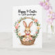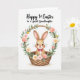 This card shows a sweet rabbit-like character with soft light-brown fur sitting snugly in a woven wicker basket, its long ears tipped with pale pink and its cheeks lightly rosy 🐰. A small fuchsia bow tie at its neck adds a dressy touch, and its wide dark eyes and tiny whiskers give it a tender, friendly look. Around the basket, a circular garland of spring flowers and leafy greens frames the scene like a gentle hug, suggesting closeness and care. Pastel pink roses, white daisies with yellow centers, and small yellow and pink blossoms are tucked between curved green leaves, all set against a plain white background. The lighting stays soft and even, keeping the colors calm and easy on the eyes. Centered above the illustration, the message “Happy 1st Easter to a special Granddaughter” appears in neat black lettering. A small 🌷 can be added near the text to echo the floral ring. The basket’s woven texture is detailed with light tan strands and subtle shading beneath the bunny.