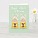 This card features a calm pastel green background that sets a gentle springtime scene. Two nearly identical cartoon-style infants sit side by side across the lower half, angled slightly toward each other with matching rosy cheeks and small crescent smiles that feel sweetly affectionate. They wear bright yellow one-piece outfits and soft bunny-eared hats with pink inner lining, adding a cozy seasonal touch 🐰. In each child’s hands is a small dark brown plush bunny with long upright ears, as if they’re sharing the same comforting companion 🐇. Above them, a congratulatory greeting about a first spring holiday appears centered near the top in flowing white lettering with a faint shadow for depth. The open space around the words keeps the focus on the pair below while the pale background stays smooth and uncluttered. The twins’ dot eyes, blush cheeks, and mirrored poses create a quiet sense of closeness. The yellow outfits sit in warm contrast against the soft green backdrop, with pink ear details repeating in both hats.