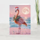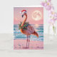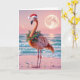 Um flamingo fica numa praia enfeitada com uma coroa de Natal e um chapéu de Papai Noel colocado contra o pano de fundo de uma lua de cheio rosa e um pôr do sol colorido