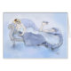 Flapper em negligência azul, deitado no sofá, uma flor vermelha de camélia no cabelo.