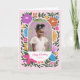 Este belo cartão de saudação de fotos de aniversário apresenta um design floral desenhado manualmente em magenta/fuchsia rosa, laranja, ouro amarelo, roxo, azul e verde sobre um fundo de cor personalizado (mostrado em rosas claro). O estilo do design floral é quase como giz / pastel. Um quadro em forma de oval / arco destaca uma foto da garotinha especial em sua vida! *Trabalho de arte criado exclusivamente por Impressões Orabella