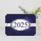 Botão de design floral ao redor sobre uma fita branca que tem designs florais. Fundo azul turvo. A parte traseira do cartão tem um fundo azul com letras brancas para os anúncios de graduação.