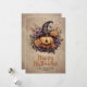 Feliz cartão de Dia das Bruxas com uma abóbora assustadora vestindo um chapéu preto e rodeado por flores em frente a uma grande teia. Personalize facilmente este cartão de Dia das Bruxas com seu nome e texto de família.