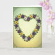 This design shows a heart-shaped wreath of daisy-like flowers centered on the card, with petals in deep purple, sunny yellow, and crisp white nestled among rich green leaves. The blooms overlap closely, like a gathered bouquet, and the snug spacing gives the heart a cozy, affectionate feel, as if it’s hugging the space inside. Behind the wreath, the background shifts from spring green at the top to a softer yellow-green near the bottom, adding a gentle glow 💚. A thin ornamental border frames the scene, with small geometric touches in the corners and tiny floral accents along the top and bottom edges. There’s no character shown, but the way the flowers lean into each other reads like close friends standing shoulder to shoulder ☘️. Any text would sit neatly within the open center of the heart, in a simple white or dark green line that stays easy to read against the gradient. The heart wreath remains the main focal point, surrounded by the delicate border details and the smooth green-to-yellow-green backdrop.