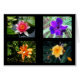 Uma coleção de quatro flores bonito, com um fundo preto e o cartão no vazio no interior.