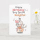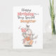 Uma bela ilustração de uma gaiola de pássaros caprichosa desenhada à mão que tem dois passarinhos fofos sentados nela cantando corações. Um lindo buquê floral está amarrado ao lado da gaiola e a ilustração está em tons de laranja, azul e amarelo pastel pêssego. As palavras, feliz aniversário a uma filha muito especial (que pode ser alterada para neta, sobrinha, afilhada, etc.) aparecem em um fundo branco. O interior tem uma mensagem terna e adorável que deve ser personalizada de acordo com qualquer relação familiar que você tenha inserido na frente.