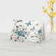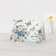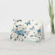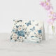 Uma mistura encantadora de delicadas borboletas azuis entrelaçadas com rosas brancas e azuis requintadas, tudo contra um fundo sofisticado de chinoiserie de renda para um agradecimento.