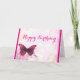 Um cartão de boas-vindas de aniversário alegre e feminino. Uma linda borboleta roxa pintada que realmente atrai sua atenção. Sobre um fundo delicado que tem uma textura única e criativa de aquarela com flores românticas, cor-de-rosa e amarelas desbotadas. Com um logotipo antigo, ligeiramente visível no fundo, para lhe dar algum talho de vintagem