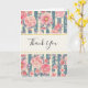 Cartões de agradecimentos com um belo padrão com flores bonito cor-de-rosa sobre o topo, com um padrão listrado composto por listras azuis e creme. Um quadro retangular com folha de ouro falsa colocada sobre cima com obrigado.