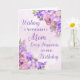 Cartão de aniversário para mãe com flores de aquarela roxas e verso pensativo.