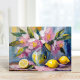 Uma encantadora pintura de arte moderna em estilo impressionista, mostrando uma vida estática de flores e limões vibrantes, expressa através de pinceladas texturizadas em tons cor-de-rosa, azuis e amarelos pastéis mudados. As cores suaves e harmoniosas criam um ambiente tranquilo, enquanto a pincelada viva adiciona profundidade e movimento à composição. Esta peça fresca e contemporânea captura a beleza da natureza, misturando elementos florais e frutas de uma forma elegante.