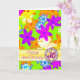 Um cartão de aniversário de casamento para dar a um casal. Flores fabulosas de 'op art' em cores vibrantes. Um cartão vibrante que diz 'FELIZ!'. As flores multicoloridas estão espalhadas sobre um fundo verde. O cartão fica em branco para ser usado como cartão de nota ou para sua própria mensagem. Veja toda a gama de cartões na minha loja. Todos os trabalhos artísticos são de direitos autorais de Norma Cornes.