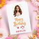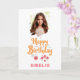 Celebre o aniversário de uma garota especial com este charmoso cartão personalizado! Apresentando um design floral desenhado à mão, um texto alegre de "Parabéns" em um roteiro lúdico de cor laranja, e uma foto e um nome personalizados. Ideal para filhas, sobrinhas, netas ou amigos.