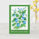 Um Cartão de Aniversário floral bonito, com flores brilhantes azuis da manhã Glória num fundo branco com uma fronteira verde e uma elegante inscrição branca. O design é uma aquarela pintada manualmente por Judy Adamson e você pode personalizar a mensagem dentro.