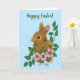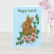 Coelho marrom giro com flores cor-de-rosa contra o pano de fundo azul claro
