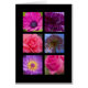 Cartão vazio que caracteriza uma colagem da foto de seis flores cor-de-rosa e roxas.