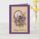 Cartão de saudação de 5" x 7" com uma imagem vintage de uma cabana coberta de neve de um lago no bosque em um oval enfeitado com flores roxas e sagrado com bagas cor-de-rosa em bege. Lavanda e borda roxa. Lá fora o sentimento diz, "Feliz Aniversário." A dentro é roxa com um sentimento personalizável que diz, "Que seu aniversário transborde com o amor da família, prazeres da vida e o calor dos bons amigos." Veja a etiqueta de presente e o adesivo. Veja toda a coleção de Convite de Aniversário nos CONVITES | Seção Convites e Cartões.