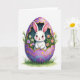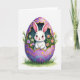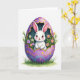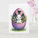This design shows a fluffy white bunny with pink-lined ears peeking out from a large egg-shaped shell, its rosy cheeks and gentle smile giving it a sweet, friendly look 🐰. The egg is deep purple and decorated with scattered gold stars and flowing teal-and-gold patterns that curl around the surface like a night-sky motif. Around the bunny, soft green leaves and small spring flowers in pink, purple, and white cluster close, as if they’re leaning in like close friends 🌷. The bunny’s wide eyes seem to meet yours with a tender, welcoming gaze, adding a hint of closeness to the scene. Inside the egg, the background shifts to a dark teal shade that makes the bunny’s white fur and the pastel blossoms stand out. Near the bottom, a gentle patch of green grass grounds the illustration against a wide area of white space. The egg’s scalloped opening frames the bunny, with the gold stars and teal swirls tracing along the purple shell.
