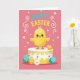 This card shows a fluffy yellow chick standing proudly on a round cake, its wide eyes and rosy cheeks giving it a sweet, friendly look, with tiny wings lifted as if reaching out for a hug 🐰. The cake is trimmed with delicate yellow lace-like piping and small red accents, making the chick look like the guest of honor at a spring party. Around the cake’s base, several decorated eggs rest in a loose circle, mixing polka dots, wavy stripes, and little stars and triangles in shades of blue, orange, and teal 🐇. The background is a soft pastel pink, sprinkled with small white flowers and curling vine-like swirls that add a gentle, affectionate mood to the scene. Near the top, a festive greeting is set in big rounded letters, with teal characters outlined or paired with bright yellow for contrast. The text sits centered above the chick and cake, leaving open space around it so the message feels airy and easy to read. The overall layout keeps the chick and cake in the middle while the eggs and white floral details frame them like friendly companions. A few white flower shapes and thin swirling curls float across the pink backdrop behind the teal-and-yellow headline.