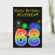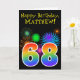 A parte dianteira deste divertimento, as características de design vibrantes do cartão do aniversário fogos-de-artifício comemorativos coloridos inspirou o teste padrão, junto com o número "68" caracterizando arco-íris colorido um teste padrão inspirado do inclinação, em um fundo colorido preto. A parte dianteira igualmente caracteriza uma mensagem do cumprimento do aniversário, incluindo um nome destinatário feito sob encomenda. As características internas uma mensagem feita sob encomenda do cumprimento do aniversário, ou poderiam talvez ser canceladas e sairiam do vazio se uma mensagem deve ser escrita à mão pelo contrário. Um cartão de aniversário customizável como este pôde ser uma maneira do divertimento de reconhecer alguém sessenta oitavos aniversários. [~Z0000330]