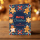 Enrole seus cartões de natal no encanto acolhedor deste cartão de Natal inspirado na arte popular. Um fundo marinho profundo arma uma vibrante borda de poinsetos vermelhos e turquesas, bagas e flocos de neve, criando uma tapeçaria festiva. Quatro figuras sorridentes de pão de gengibre — dois biscoitos clássicos e duas estrelas de floco de neve — traem o design. Este cartão é uma mistura deliciosa de estilo moderno e espírito de feriado tradicional, com texto personalizável na frente e dentro para um toque pessoal.