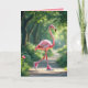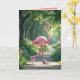 Um flamingo, tênis e fones de ouvido cor-de-rosa vestidos, percorre com confiança um caminho iluminado pelo sol, rodeado por um verde exuberante e flores florescentes. O texto do dentro pode ser alterado.