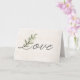 Texto do LOVE em letra de script elegante com folhas verdes em fundo de textura neutra suave para felicitar recém-casados