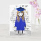 Menina bonita com cabelo louro longo, diploma de graduação, vestido azul, tênis e boné para parabéns formandos.