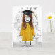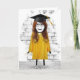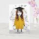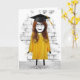 Garota bonitinha com cabelo comprido, diploma de graduação, tênis, boné preto e vestido de ouro para parabéns formandos.
