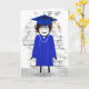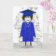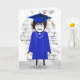 Menina bonita de cabelos escuros curtos, diploma de graduação, vestido azul, colar pérolas, tênis e boné para parabéns formandos.
