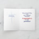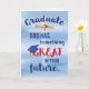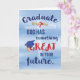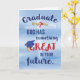 Deus está no trabalho em nossas vidas e tem planos maravilhosos para o formando enquanto caminham no seu plano de excelente. Este cartão de graduação de parabéns religiosos tem um fundo de aquarela azul claro com um boné de formatura azul e um diploma com fita vermelha em torno da mensagem.
