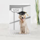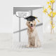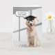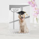 Ouro loiro recuperador no chão da madeira com fundo sombreado e boné de formatura preto com tassel de ouro. O texto é editável.