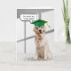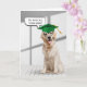 Retalhista de ouros loiros no chão de madeira com fundo sombreado e boné de formatura verde e óculos