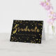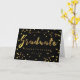 Cartão de comemoração personalizado preto e dourado com belas imagens gráficas de confete de folha de ouro falso e com o elegante texto fixo 'Formando' do script casual de pincel e texto dourado personalizável sobre fundo preto. Cartas modernas e glamourosas para garotas. Se precisar de assistência para personalizar seu produto, entre em contato comigo através da minha loja e eu ficarei feliz em ajudar. NOTA: Estas são imagens gráficas impressas em formato plano - não folhas de ouro reais. Tenho produtos correspondentes na minha loja.