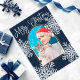 Mande alegria de Natal com nosso Cartão de Férias de Natal Frame de Neve, uma maneira elegante e simples de espalhar alegria festiva. Este design chic apresenta flocos de neve brancos pintados à mão e um flurry de neve sobre um fundo azul clássico de marinho, complementado por um arco duplo de ouro impresso a preto que arma uma foto de você e/ou de sua família. Com sua estética moderna, bonito e única, este cartão certamente impressionará seus amigos e família com seu charme de eterno.