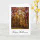 Cartão de saudação de folhagem para o dia das bruxas, com um design de tipografia de script e uma foto de cena de cor laranja e vermelha. Com as letras negras, você pode personalizar com seu próprio texto. Uma maneira adorável de dizer Feliz Dia das Bruxas aos seus amigos e familiares.