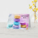Cartão de saudação com uma fotografia deliciosa com uma pilha de macarões coloridos.