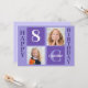 Bonito cartão de aniversário de 2 fotos no quadrado feliz para uma garotinha ou um adolescente. Comemore o aniversário do seu filho com duas fotos bonitinhas delas neste cartão "adicione sua própria fotografia" com lindos quadrados roxos. Adicione seu nome e idade.