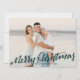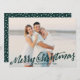Cartão com fotos festivo apresenta sua foto favorita horizontal ou orientada a paisagem em cheio sangrando, com "Feliz Natal" sobreposto na tipografia do pincel verde-coroa. Personalize com seus nomes e o ano na base. Cartões invertem para um padrão de confete branco sobre uma cor de fundo coordenada totalmente personalizável.
