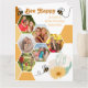 Cartão de aniversário divertido e peculiar com suas fotos personalizadas organizadas no padrão de mel. A design apresenta bonitinhas mamangabas, favos de mel, flores de rabisco e corações de amor com retrorreflectores para o trocadilho, Bee Happy. Você pode personalizar a mensagem na frente e também ter a opção de editar o dentro de mensagem, que atualmente lê "Tenha um aniversário maravilhoso e seja feliz hoje e todos os dias". O modelo de foto está configurado para que você adicione 6 de suas fotos favoritas que serão exibidas na forma hexágono.
