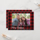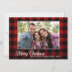 Um belo estilo rústico, xadrez de búfalos vermelhos - cartão de feriado tartan com roteiro de caligrafia "Feliz Natal", seu nome familiar, ano ou outro texto e sua foto de família. Personalize sua mensagem na parte traseira do cartão para o toque perfeito.